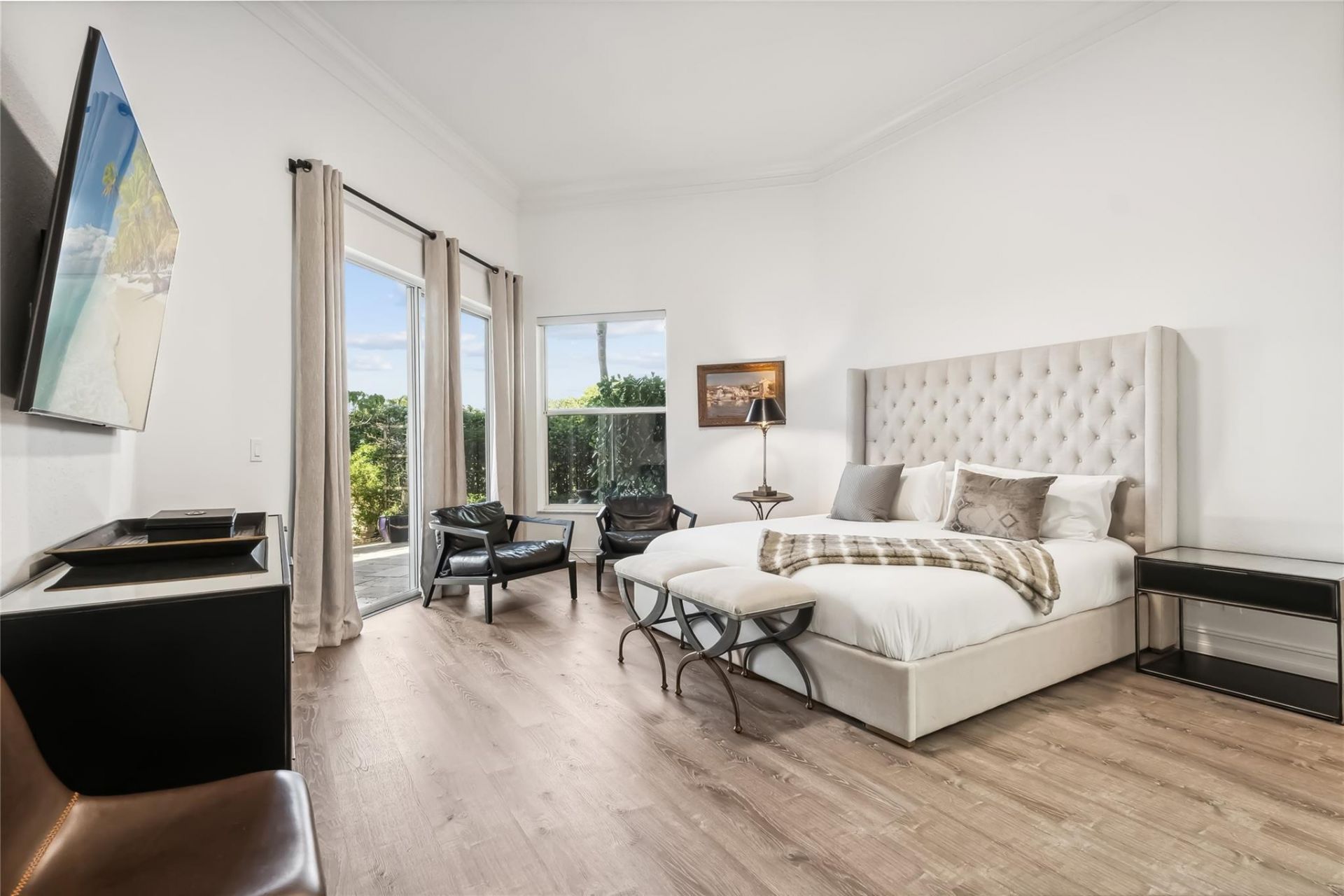 Updated contemporary Polo Club home featuring 3 bedrooms, 3 full and 1 half bathrooms, a 2.5-car garage, and a private pool overlooking the Cypress golf course. The 2, 400-square-foot split floor plan offers a light and bright modern design with wood flooring throughout, tray ceilings with custom crown molding, a formal dining area, and a spacious primary suite with patio access. Outdoor living includes a covered patio, travertine tile pool deck, dark-tiled in-ground pool, and beautiful golf cou...Updated contemporary Polo Club home featuring 3 bedrooms, 3 full and 1 half bathrooms, a 2.5-car garage, and a private pool overlooking the Cypress golf course. The 2, 400-square-foot split floor plan offers a light and bright modern design with wood flooring throughout, tray ceilings with custom crown molding, a formal dining area, and a spacious primary suite with patio access. Outdoor living includes a covered patio, travertine tile pool deck, dark-tiled in-ground pool, and beautiful golf course views.